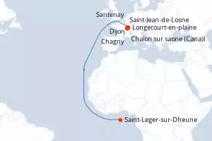 Itinerario : Dijon, Longecourt-en-plaine, Saint-Jean-de-Losne, Chalon sur saone (Cana)l, Chagny, Santenay, Saint-Leger-sur-Dheune