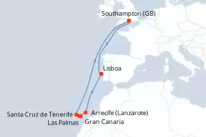 Itinerario : Southampton, Praia da vitoria, Punta Delgada, Las Palmas, Gran Canarias, Santa Cruz de Tenerife, Arrecife (Lanzarote), Southampton
