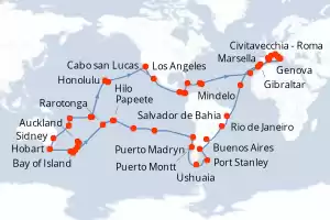 Itinerario : Genova, Marsella, Barcelona, Gibraltar, Casablanca, Mindelo, Salvador de Bahia, Rio de Janeiro, Buenos Aires, Puerto Madryn, Puerto Argentino, Ushuaia, Puerto Montt, Valparaíso, Isla de Pascua, Pitcairn, Papeete, Moorea, Aitutaki, Rarotonga, Bay of Island, Auckland, Tauranga, Christchurch, Dunedin, Milford sound, Hobart, Sidney, Nouméa, Luganville, Apia, Pago Pago, Honolulu, Hilo, Los Angeles, Cabo san Lucas, Puntarenas, Canal panama (Enter), Canal de Panama, Ocho Rios, Road Town, Philipsburg, Las Palmas, Palma de Mallorca, Nápoles, Civitavecchia - Roma, Genova, Marsella, Tarragona, La Coruña, Bilbao, La Rochelle, Brest, Warnemunde