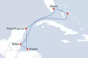 Itinerario : Miami, Willemstad(Curaçao), Oranjestad (Aruba), Santa Marta, Cartagena de Indias, Gran Caiman, Miami, Cozumel, Costa Maya, Santo Tomas, Belice, Roatan, Miami