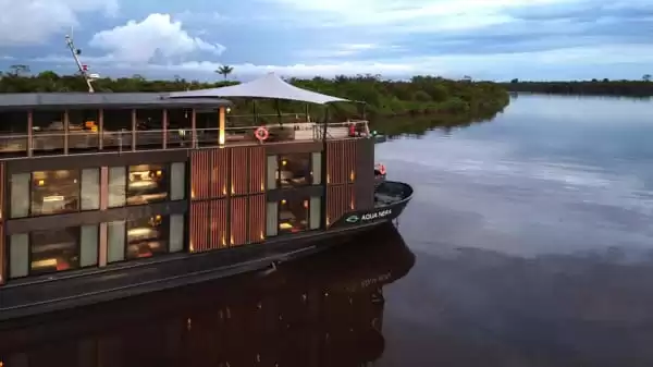 Diseñado por el estudio Studio Noor en Ho Chi Minh, el Aqua Nera se inspira en las lagunas de aguas negras amazónicas y juega sutilmente con los contrastes entre un ambiente tenue y detalles de artesanía peruana, española y portuguesa. Con más de 62 metros de largo, este barco de diseño moderno y líneas depuradas presenta una silueta elegante, concebida para navegar con facilidad por los meandros profundos y poco explorados de la Amazonía peruana. Su decoración interior, sobria y sofisticada, rinde homenaje a la riqueza cultural de la región, con guiños a los motivos tradicionales shipibo-conibo, los mosaicos de Iquitos y materiales nobles.