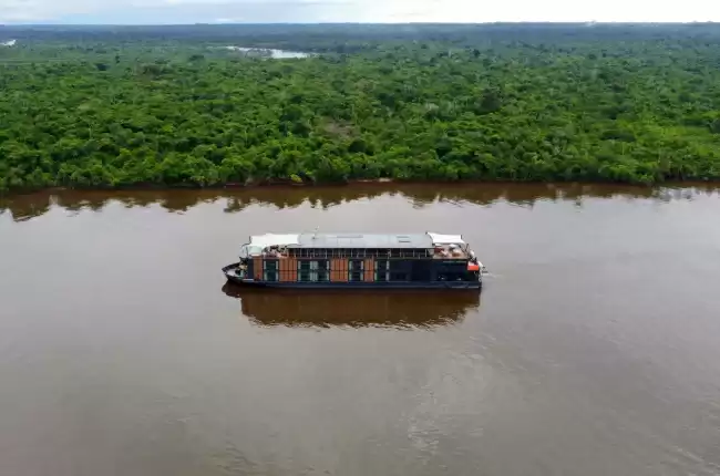 Gracias a su tamaño contenido, accede a zonas apartadas dentro de la reserva Pacaya Samiria, ofreciendo un entorno de exploración íntimo y exclusivo. A bordo, los espacios comunes se distribuyen en tres pisos, y cada área fue pensada para ofrecerte confort e inmersión: un sundeck en la proa con piscina infinita, cabañas con sombra y bar lounge, un salón-biblioteca de diseño elegante, una sala de proyecciones, mesa de billar, gimnasio panorámico con vista al río, dos cabinas de spa, enfermería y una boutique dedicada a la artesanía local. Para garantizar el máximo confort, el barco está equipado con tecnología avanzada: generadores silenciosos Caterpillar con norma Tier 3, climatización central y sistema eléctrico confiable de 220 voltios.