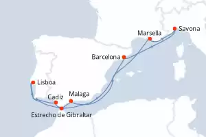 Itinerario : Barcelona, Estrecho de Gibraltar, Lisboa, Cadiz, Malaga, Marsella, Savona, Barcelona