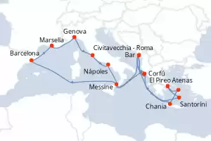 Itinerario : Barcelona, Marsella, Ajaccio, Genova, La Spezia, Civitavecchia - Roma, Nápoles, Chania, Kusadasi, Mykonos, El Pireo Atenas, Santoríni, Bar, Corfú, Messine, Barcelona