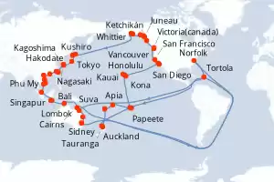 Itinerario : Sidney, Norfolk, Auckland, Tauranga, Suva, Isla Dravuni, Apia, Papeete, Moorea, Raiatea, Honolulu, Kauai, Kona, Los Angeles, San Diego, San Francisco, Victoria, Vancouver, Ketchikán, Juneau, Skagway, Hubard Glacier, College Fjord, Whittier, Kushiro, Hakodate, Tokyo, Kagoshima, Nagasaki, Ishigaki, Taipei, Hong Kong, Baia de Halong, Chan May, Cami Ranh, Phu My, Singapur, Lombok, Bali, Darwin, Cairns, Tortola, Airelie Beach, Brisbane, Sidney