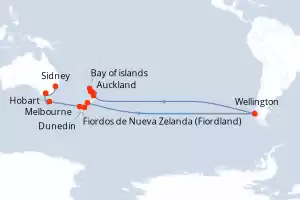 Itinerario : Auckland, Bay of islands, Tauranga, Wellington, Christchurch, Dunedin, Fjordland, Hobart, Melbourne, Sidney