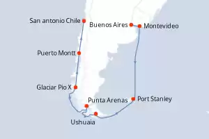 Itinerario : San antonio Chile, Puerto Montt, Puerto Chacabuco, Fiordos Chilenos, Glaciar Pio X, Canal Sarmiento, Magallanes (Estrecho), Cockburn and Beagle Channels, Punta Arenas, Ushuaia, Cabo de Hornos, Puerto Argentino, Montevideo, Buenos Aires