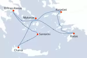 Itinerario : El Pireo Atenas, Santoríni, Chania, Kusadasi, Rodas, Mykonos, El Pireo Atenas, Kotor, Corfú, Messine, Palma de Mallorca, Barcelona, La Valetta, Chania, Santoríni, Kusadasi, El Pireo Atenas