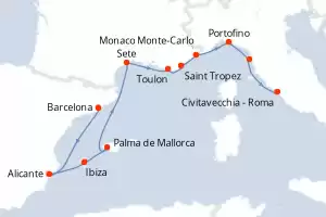 Itinerario : Barcelona, Alicante, Ibiza, Palma de Mallorca, Sete, Toulon, Saint Tropez, Monaco Monte-Carlo, Portofino, Pisa/Florencia (Livorno), Civitavecchia - Roma