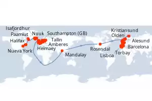 Itinerario : Nueva York, Halifax, Sidney, Paamiut, Nuuk, Isafjordhur, Akureyri, Grundarfjordur, Reykjavik, Heimaey, Seydisfjordhur, Kirkwall, Stornoway, Killybegs, Douglas, Dun Laoghaire, Liverpool, Holyhead, Waterford, Southampton, Honfleur, Amberes, Amsterdam, Lysekil, Arhus, Warnemunde, Liepaja, Visby, Helsinki, Tallin, Estocolmo, Copenhague, Lysekil, Oslo, Skagen, Mandalay, Rosendal, Olden, Kristiansund, Trondheim, Hammerfest, Honningsvag, Torbay, Alesund, Maloy, Lerwick, Invergordon, Zeebrugge, Amsterdam, Burdeos, Oporto, Lisboa, Cadiz, Malaga, Barcelona