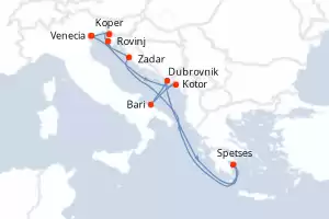 Itinerario : Venecia, Koper, Rovinj, Kotor, Bari, Dubrovnik, Spetses, Zadar, Venecia, Koper, Rovinj, Kotor, Bari, Dubrovnik, Spetses, Zadar, Venecia