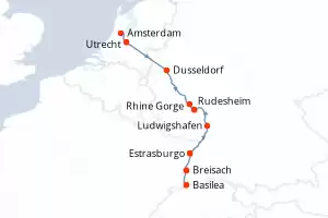 Itinerario : Amsterdam, Utrecht, Dusseldorf, Rhine Gorge, Rudesheim, Ludwigshafen, Estrasburgo, Breisach, Basilea