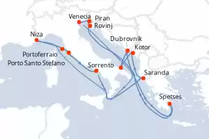 Itinerario : Niza, Portoferraio, Porto Santo Stefano, Sorrento, Saranda, Kotor, Monopoli, Dubrovnik, Sibenik, Rovinj, Piran, Venecia, Niza, Portoferraio, Porto Santo Stefano, Sorrento, Saranda, Kotor, Monopoli, Dubrovnik, Sibenik, Rovinj, Piran, Venecia