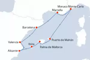 Itinerario : Barcelona, Marsella, Monaco Monte-Carlo, Puerto de Mahón, Palma de Mallorca, Ibiza, Alicante, Valencia, Barcelona, Marsella, Monaco Monte-Carlo, Puerto de Mahón, Palma de Mallorca, Ibiza, Alicante, Valencia, Barcelona