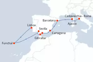 Itinerario : Lisboa, Funchal, Sevilla, Gibraltar, Malaga, Cartagena, Barcelona, Ajaccio, Civitavecchia - Roma
