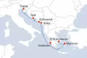 Itinerario : Trieste, Split, Dubrovnik, Kotor, Katakolon, Mykonos, El Pireo Atenas